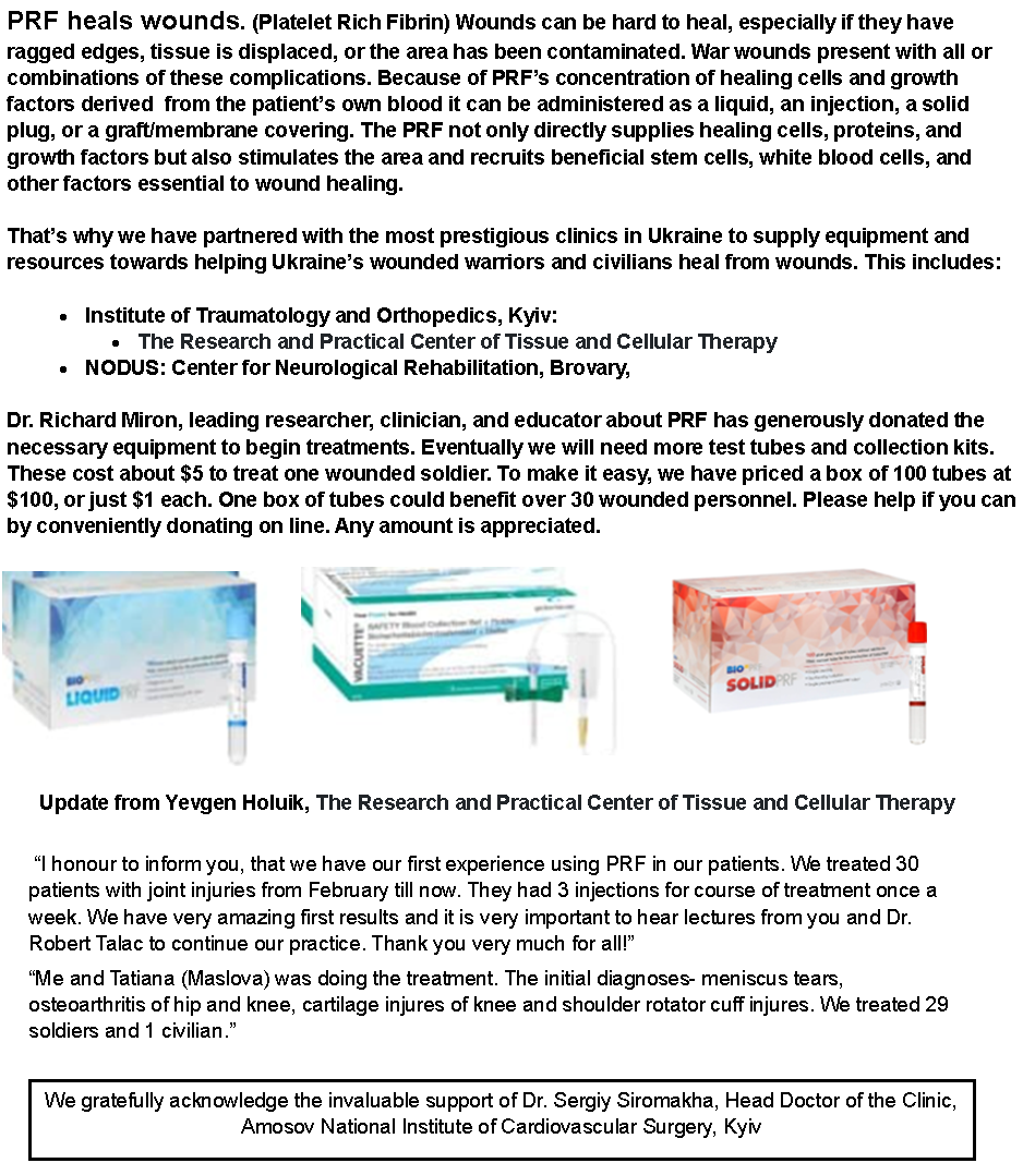 Dr. Andrii Barkovski is an orthopedic surgeon who gave up his private practice in Kyiv when the war re-started in 2022, and joined the army. He is responsible for a clinic in Odesa, only 60 miles from the front, that is one of the first medical facilities off the near-front where wounded soldiers are treated. The benefits of having PRF as a treatment option would be transformative. Our goal is to raise $5000 for the equipment and then travel there to do the set-up and train staff members in its use. Please consider helping with a donation. Contact me directly or use the “button” above. Thanks so much for your support! Feel free to contact me for specifics or more information. (As always, credit for PRF research, development, and dissemination is due to Dr. Richard Miron, Jupiter, FL. )